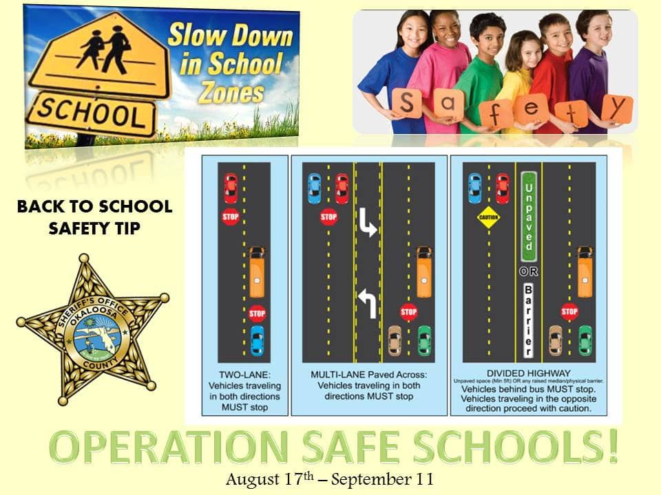 The Okaloosa County Sheriff’s Office is taking part in an initiative created by the Florida Sheriff’s Association called “Operation Safe Schools.” In the first week of operation, OCSO deputies reported 44 school zone warnings, 20 school zone citations, one pedestrian violation, and one school zone related stop which resulted in a felony narcotics arrest. The program’s goal is to protect students with increased patrols in school zones, at bus stops, and at crossing guards locations – and to increase public awareness about the need for vigilance now that school is back in session.