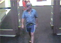 The white male suspect was wearing blue swimming trunks, with a blue, button up,